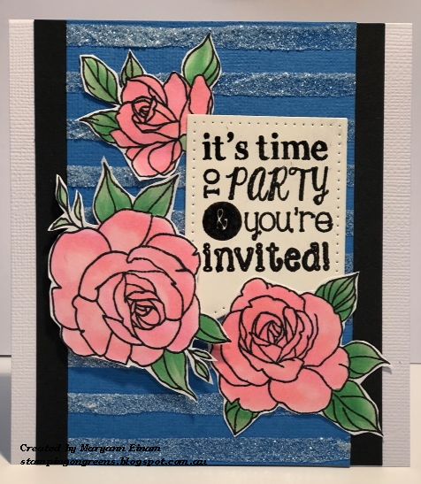 My stamped images are from the Picture perfect stamp set from My Favorite Things. The image is put onto a belly band that you take off to open the card.