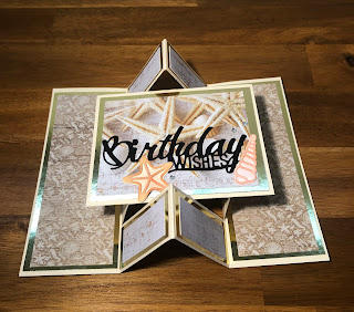 I created an under the sea theme for the inside of the card. Using the mini pops pop-up die to make the pop-up part of the card I then die cut the wavy edges to look like water and added the sea life.